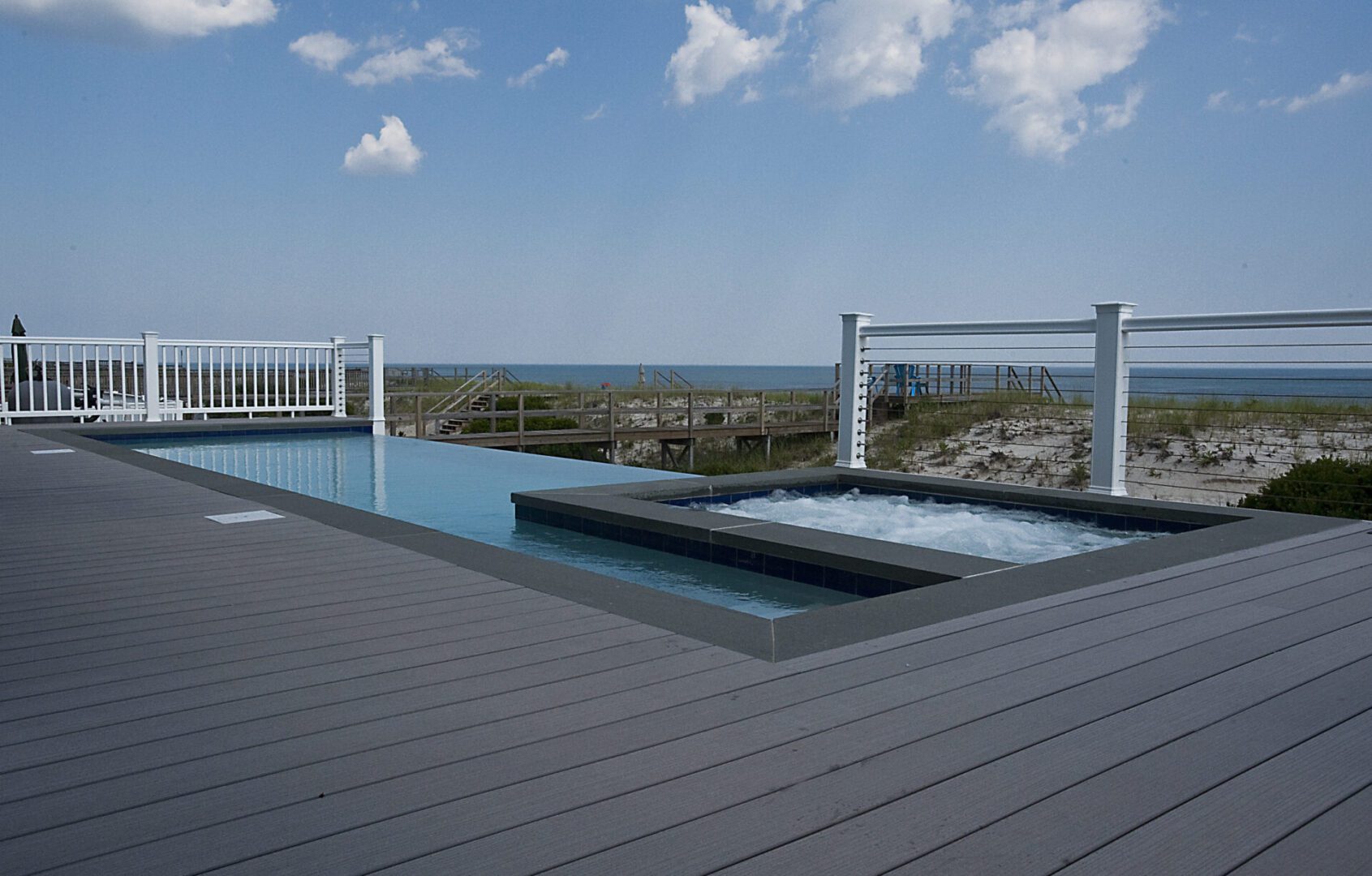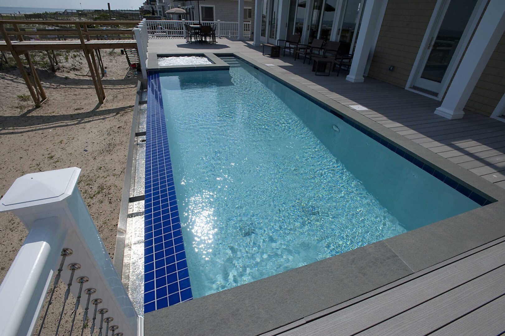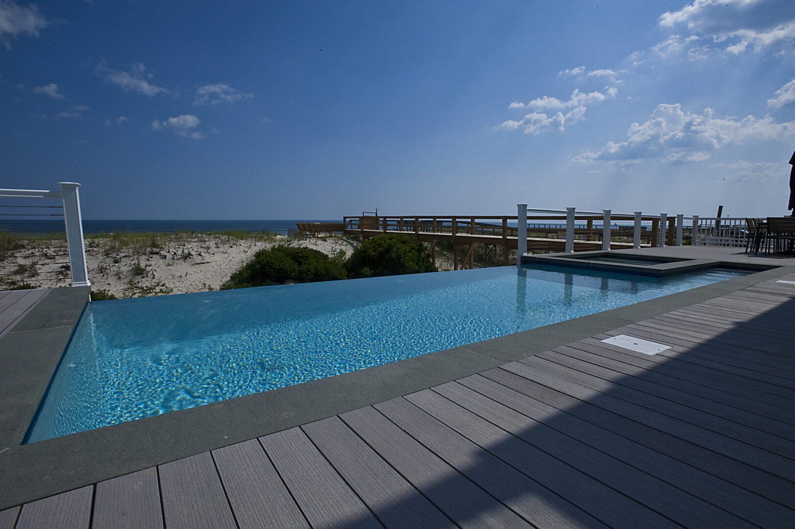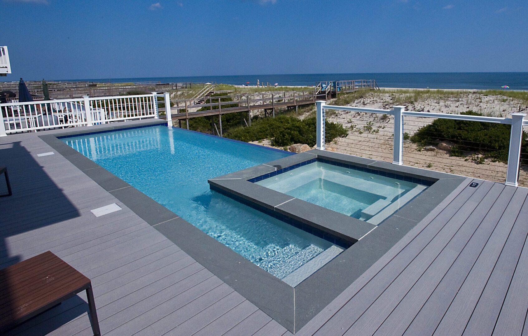 Although this project is built 12 feet above grade using pilings and piers, this 14’ x 28’ project packs a lot! Its most impressive feature is its 22’ water-on-water negative edge. The project also features a 6’ x 6’ fully jetted spa, a total of 6 LED lights (2 – 4,000,000), but no heating system.