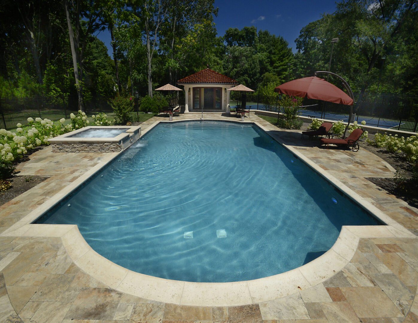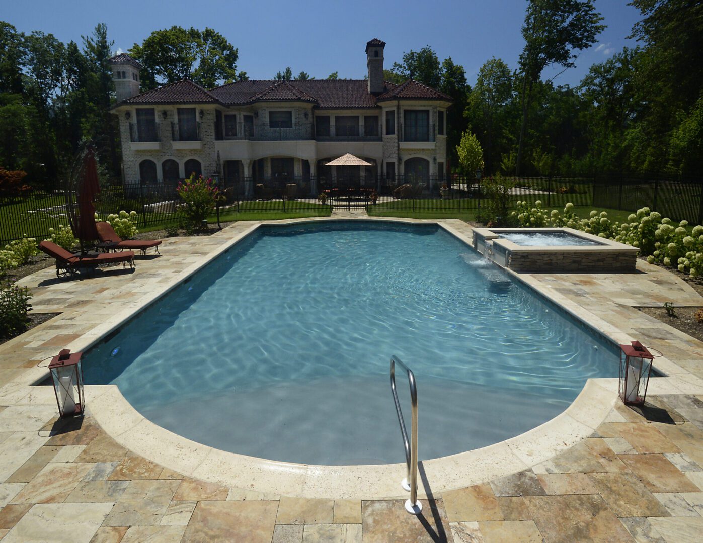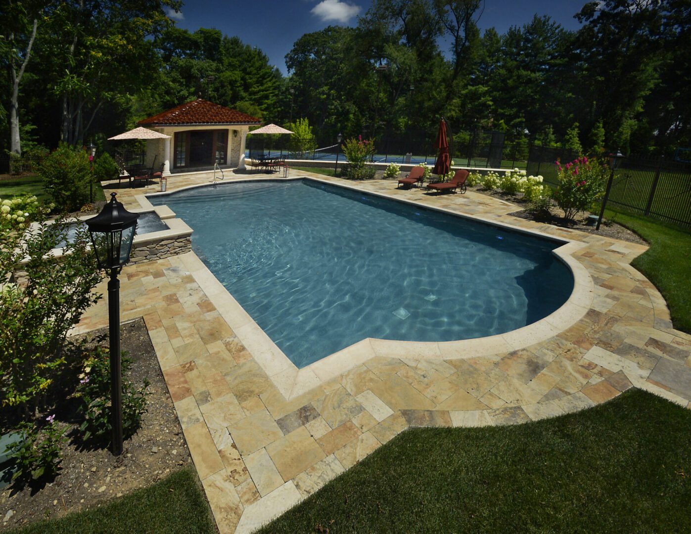 This pool-spa combination was designed to sit within the plush grass surrounds. This project has all the bells and whistles of any project. It’s completely automated, and the 10’ x 10’ spa features 10 therapeutic jets and is situated next to the pool house.