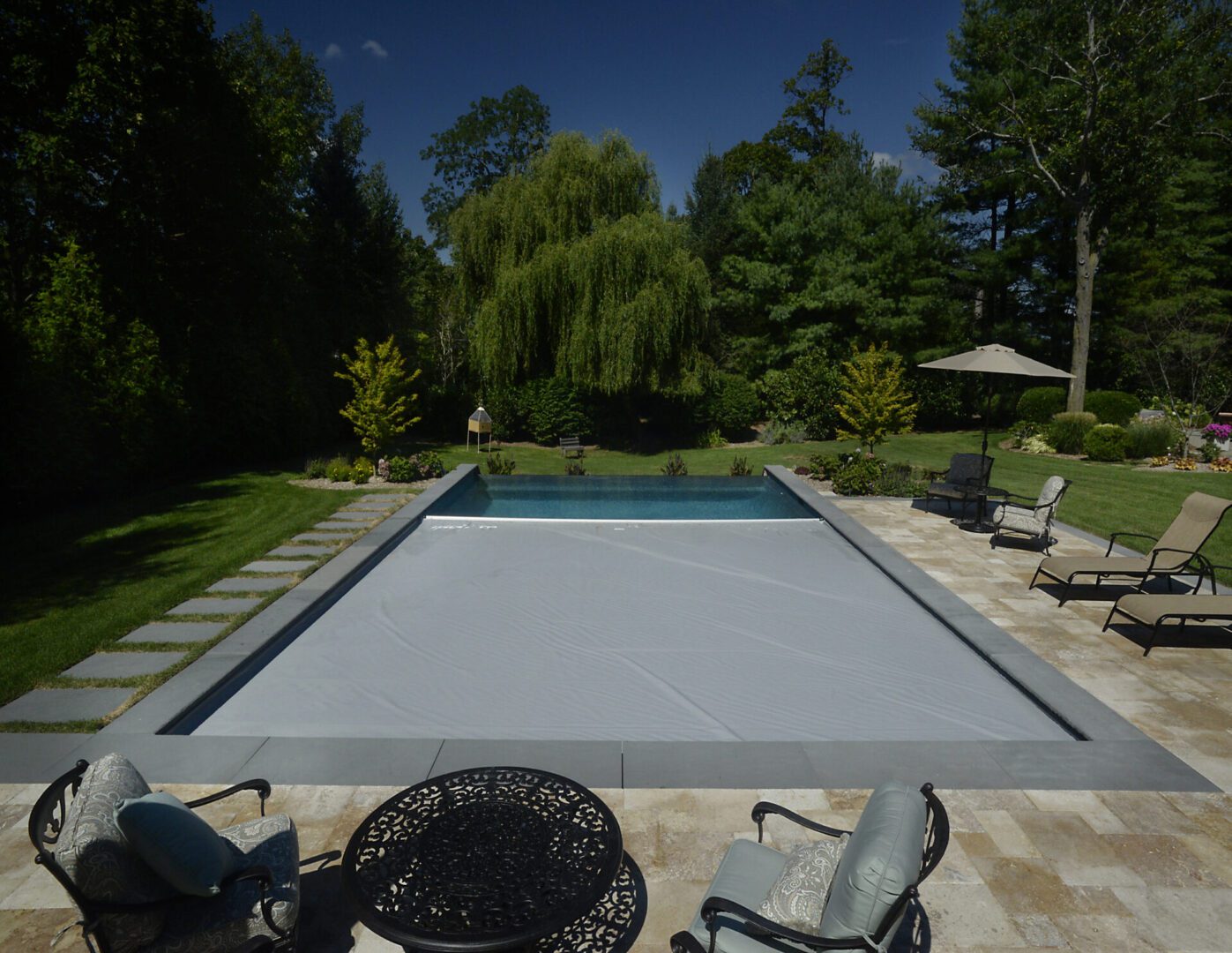 This project features a 20’ x 40’ gunite swimming pool with a 20’ negative edge, as well as an automatic safety cover system. The project uses 5 hp of pumps, a total of 8 LED lights, a 400,000 BTU heating system, and a saltwater system, all of which are controlled by the system’s automation system. The patio surrounds a total of 880 sq ft. It’s finished with imported sandstone travertine, which is bordered with a 14” bluestone coping and border stone.