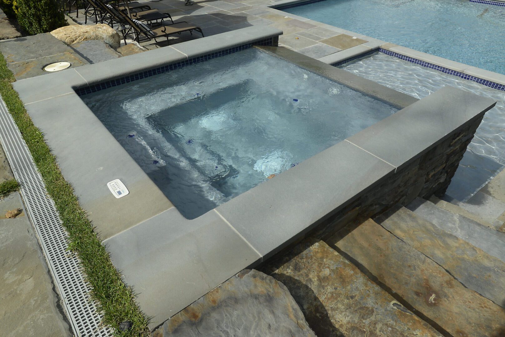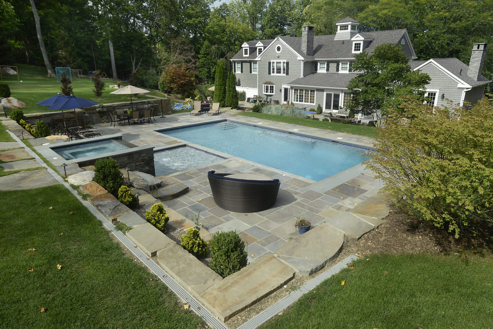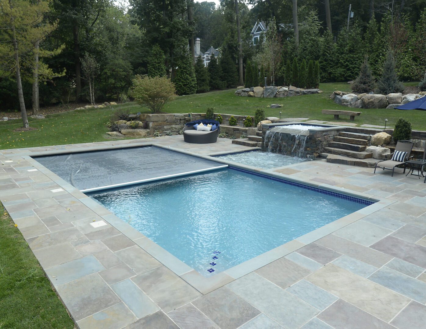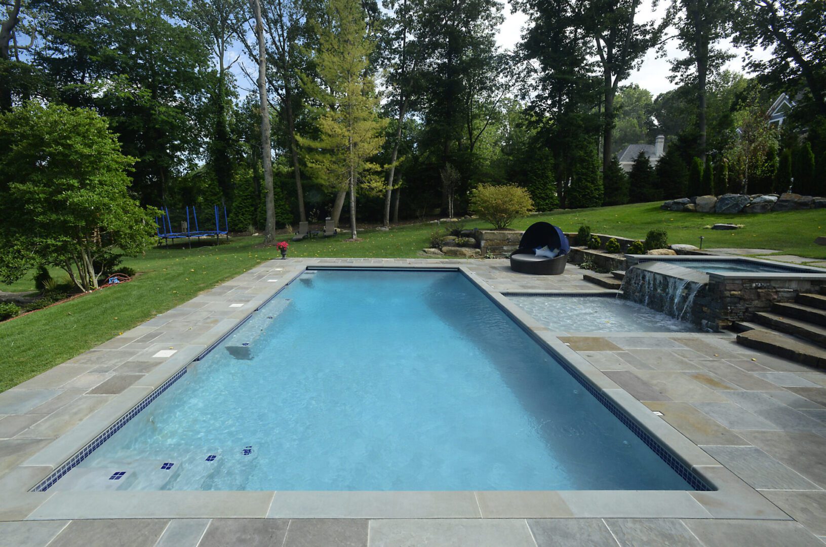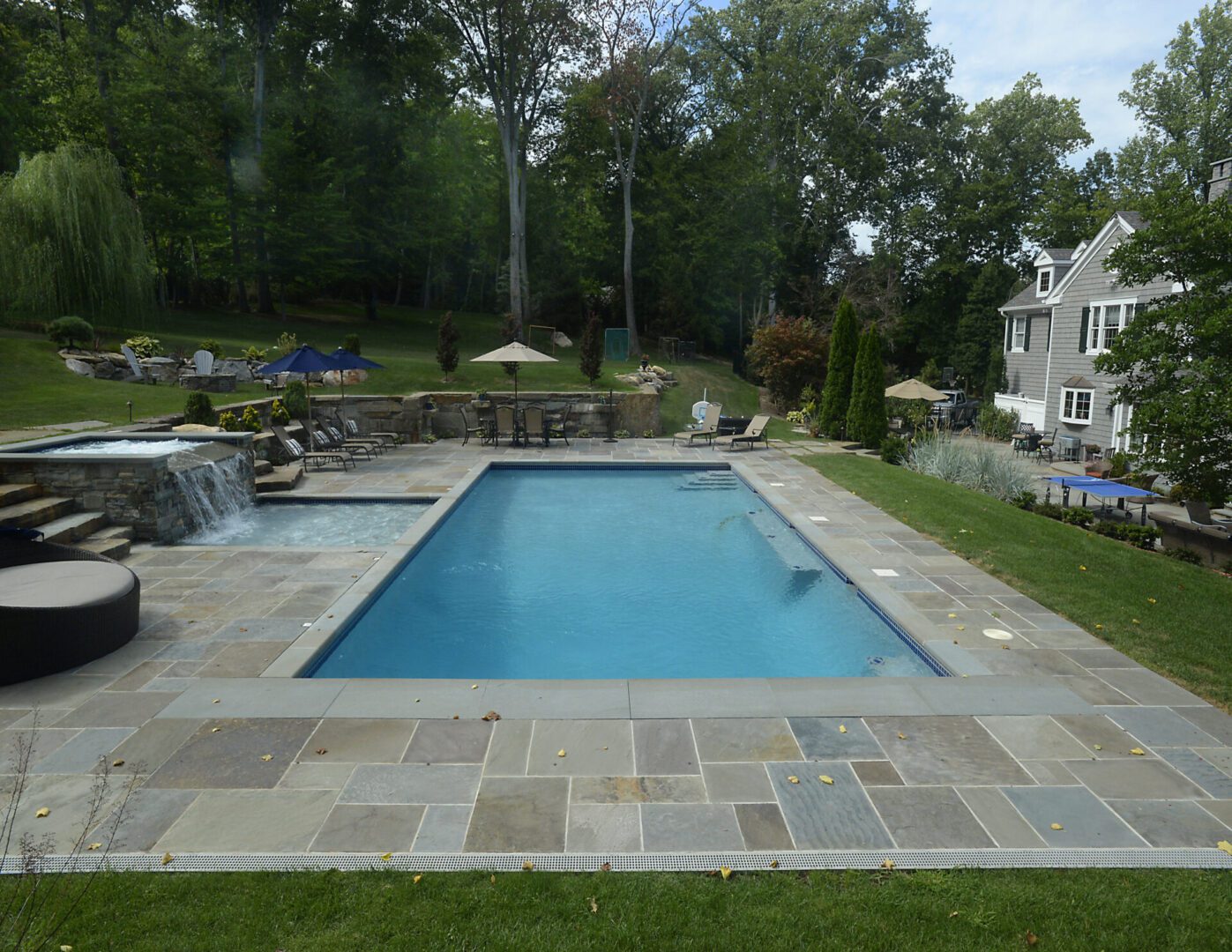 This rustic mountain backyard retreat was a complete design of the backyard. The 20’ x 40’ unite swimming pool along with the independent 10’ x 10’ spillway spa with attached 12’ x 12’ kiddie pool. The pool, spa, and lighting are completely automated. The pool features 6 LED lights, a 14-foot-long fully jetted bench, and an automatic electric safety cover system. The spa features 8 therapeutic whirlpool jets and its own filtration and 400,000 BTU heating system. Over 50,000 tons of large boulder stones were brought to the site for the retaining walls, while 2,500 sq ft of natural bluestone was used to create the patio areas. This project truly brings the clients love for the mountains to life in their own backyard!