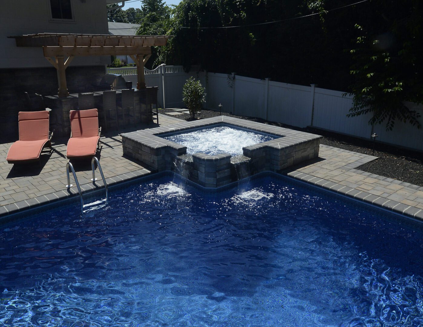 This project completely shows that anything is possible, even in vinyl! The features of this project include an 18’ x 40’ steel wall vinyl swimming pool with an attached steel wall vinyl-covered 8’ x 8’ fully jetted double spillover spa. There’s a total of 8 LED lights and 400,000 BTU of heat. The pool includes an 8 ft bench. There is a total of 1300 sq ft of Cambridge Paver patio; the pergola gives guests an area of shade to sit under while cooking at the outdoor kitchen and bar areas.
