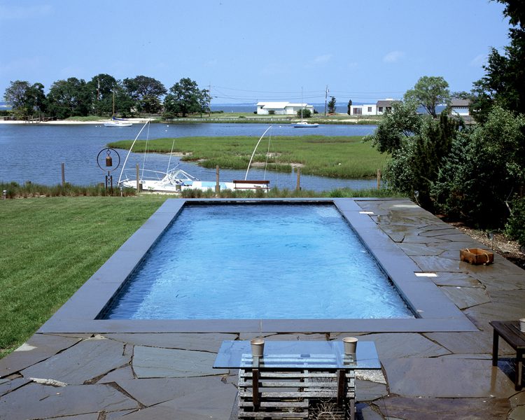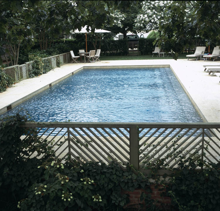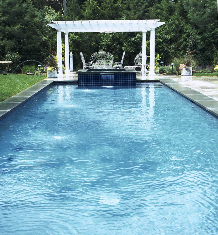 To build one of these pools, our construction crew digs a hole, puts the plumbing in place, and assembles a framework grid with 3/8-inch steel reinforcing rods (rebar). The rebar rods are spaced about 10 inches apart and secured together with wire. When the grid is in place, the crew sprays a heavy coating of gunite, a mixture of cement and sand, around the rebar. The sprayer unit combines dry gunite mix with water just before spraying—this produces the wet concrete material. The crew trowels the gunite smooth and lets it sit for a week or so before applying a smooth finish to the rough surface.